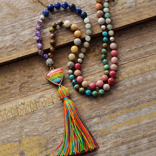 108 Mala Beads | 7 Chakra Natural Gem Stone Long Necklace Reiki Tassel Pendant 8mm Crystal Beads Buddhism
